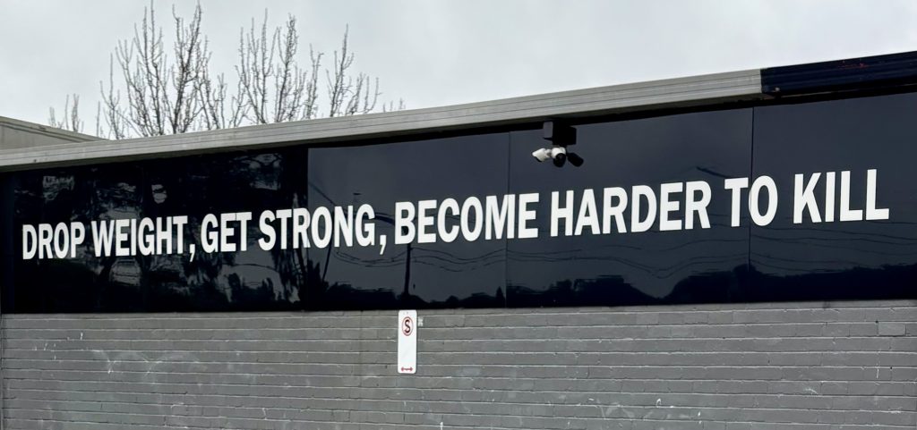 This picture is a sign for a local Melbourne fitness centre. I was not clear if this was a brand promise, positioning statement and who it was targeting! People who want to be harder to kill? I guess if you are healthier, lose excess weight it follows that you may be more resistant to disease. Or is it to be able to defend yourself?